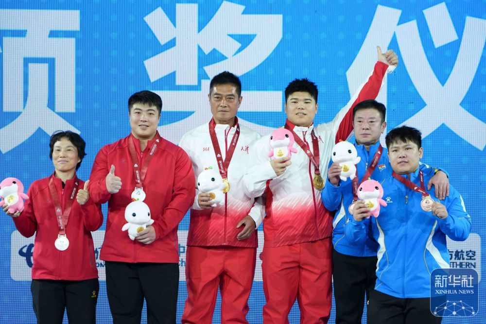 11月19日,在广东东莞举行的第十五届全运会男子举重102公斤级决赛中,天津队选手刘焕华获得冠军,个人选手王志浩和辽宁队选手邹元庆分别获得亚军和季军。 ↑ 天津队冠军刘焕华(右三)、个人亚军王志浩(左二)、季军辽宁队选手邹元庆(右一)与教练在颁奖典礼上合影。 ↑ 天津队选手刘焕华成功举起抓举比赛后庆祝。最终,他获得了冠军。 ↑ 个人运动员王志豪在挺举比赛中成功举重后庆祝。最终,他获得了第二名。 ↑ 天津队选手刘焕华亮相抓举比赛。最终,他获得了冠军。 ^ 天津队选手刘焕华在抓举比赛中。最终他获得了冠军离子能力。 ^ 天津队选手刘焕华在挺举比赛中。最终,他获得了冠军。 ↑ 天津队球员刘焕华(右)赛后向女友求婚。 ↑ 天津队球员刘焕华(左)赛后向女友求婚。 ↑ 天津队球员刘焕华(左)赛后向女友求婚。新华社记者 杨晨光 摄 上一篇:全运会|邵雨绮夺得田径女子跳高冠军 下一篇:没有了