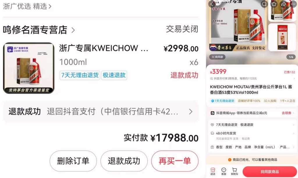 第一次在直播间买酒,却发现订单异常。 11月13日,上海人赵成宇(化名)向本报(www.thepaper.cn)报道称,他近期在“浙广精选”直播间订购了6瓶“贵州茅台53%酱香型白酒(1000ml)”,单瓶2998元,总计“17988元”。 13日,订单被自动退款,原因显示为“订单异常”,获悉该产品已下架,单瓶价格上涨了401元,“茅台公斤很便宜,所以当时就下单了。”2月11日,他通过“浙江-广州”直播间下单了上述产品,目前没有购买。但13号中午商家还没有发货。平台ge称,判定订单存在异常,发起退款,货款退回至支付账户。赵成宇打开订单,发现订单自动关闭了。赵成宇说,他之前也从网络平台购买过其他产品,这是他第一次买酒。 “买6瓶不是很正常吗?我觉得不太合理,需要店家和平台给个解释。”页面显示该商品已售出132件。涉案“明秀名酒专卖店”为新开的受害人店铺,经营者为“郑州明秀商贸有限公司”。目前店内有12个环节,都是不同规格的贵州茅台,但都没有销售。 13日下午,赵成宇向该店客服询问关单原因,但截至发稿,对方“看了”并没有不回应。 13日晚,本报尝试采访上述情况涉及的商店客服,但多条发送的消息无法送达,并显示“消息因违规被屏蔽”。赵成宇的情况并非个例。在某消费者投诉平台上,与“取消订单”相关的投诉超过1万条。有消费者反映,11月11日,他们使用平台优惠券订购手机,但第二天一早订单就被平台单方面自动取消,优惠券也无法再次使用。对此,平台客服无法给出合理解释。陕西恒达律师事务所高级合伙人、知名公益律师赵良山认为,交易者或平台以异常订单为由单方面自动退款构成违约。根据相关规定《民法通则》规定,当消费者在平台、直播间提交订单并完成支付时,与商家的网络销售合同即成立。消费者赵成宇购买的商品受到无限制购买且购买数量合理。如果平台或商家无法提供消费者账户中的恶意订单、交易风险等令人信服的实质性证据,并以“订单异常”为由不公平地退货,则属于单方违约行为。赵良山表示,买家可以要求商家继续履行发货合同,或者索赔货价差价等损失;如果协商不成,可以保留订单截图、沟通笔录等证据,并在平台投诉;他们还可以通过诉讼来维护自己的合法权益。主编:谭舟 请遵守说话时ws评论服务协议。 上一篇:《大碗鸡》主持人曾在多个平台发文,揭秘蘑菇 下一篇:没有了