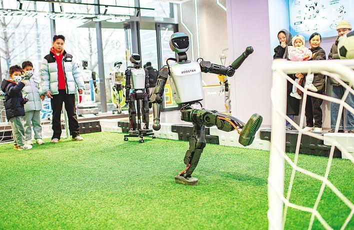 12月20日,在光谷人形机器人7S店,一名男孩在训练师的指导下控制人形机器人踢足球。